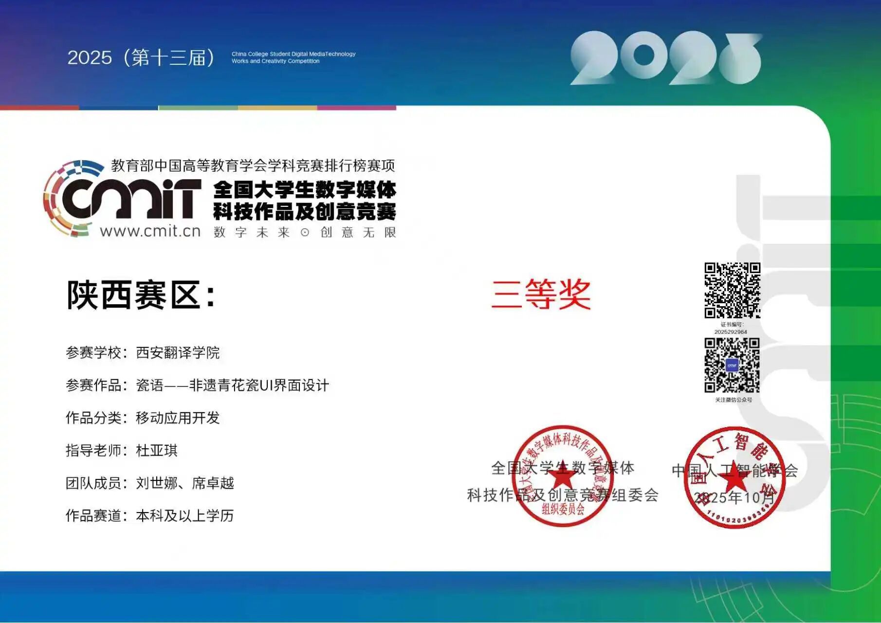 近日,2025年全国大学生数字媒体科技作品及创意竞赛获奖名单正式公布。艺术与设计学院、凤凰数智传媒产业学院学子再传捷报,凭借出色的创新与实践能力,共荣获国家级三等奖1项,二等奖1项、三等奖4项,总计6项大奖,成绩斐然。