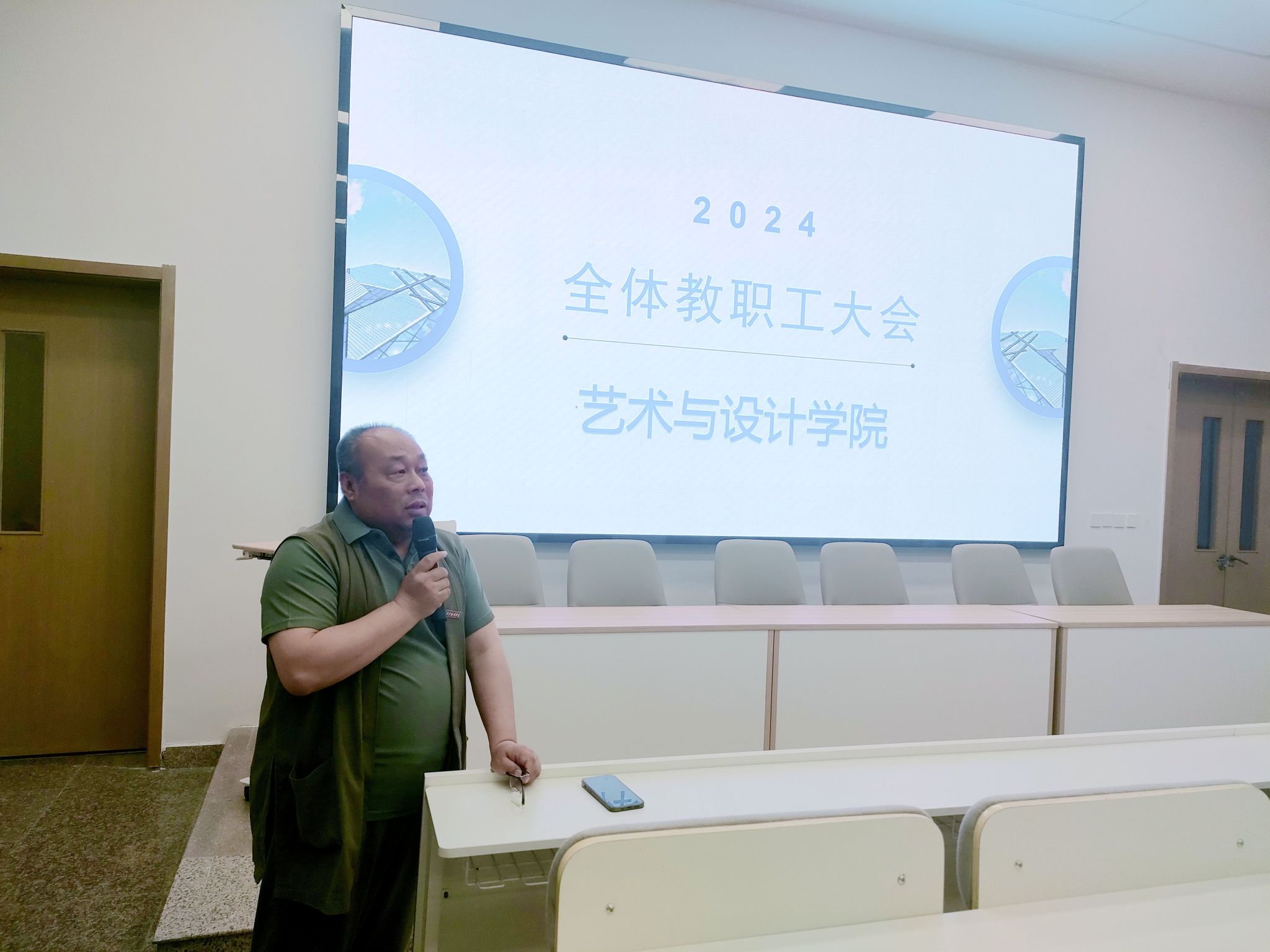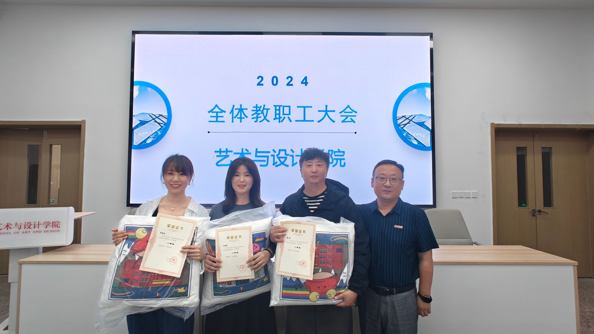 为进一步做好艺术与设计学院4月份工作总计和顺利完成毕业生答辩工作。5月14日中午,艺术与设计学院召开全体教职工大会,对外出写生实习表现的优秀教师进行表彰奖励,以及对毕业生答辩工作进行安排。艺术与设计学院院长董千,党委书记、副院长徐中,副院长马平,视觉传达系陆宝新教授、综办主任李宁和各专业负责人以及全体教职工参会。会议由环境艺术系主任吴迪主持。