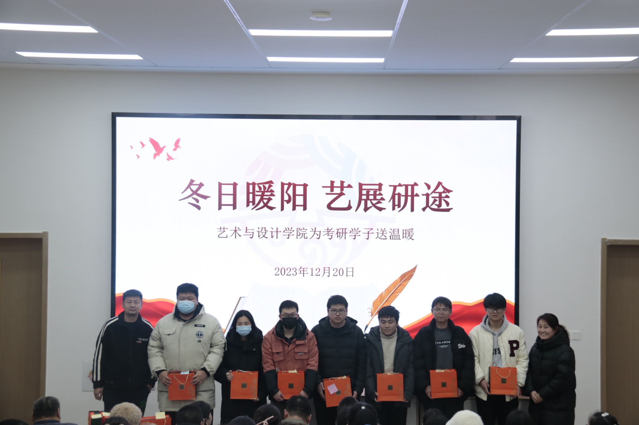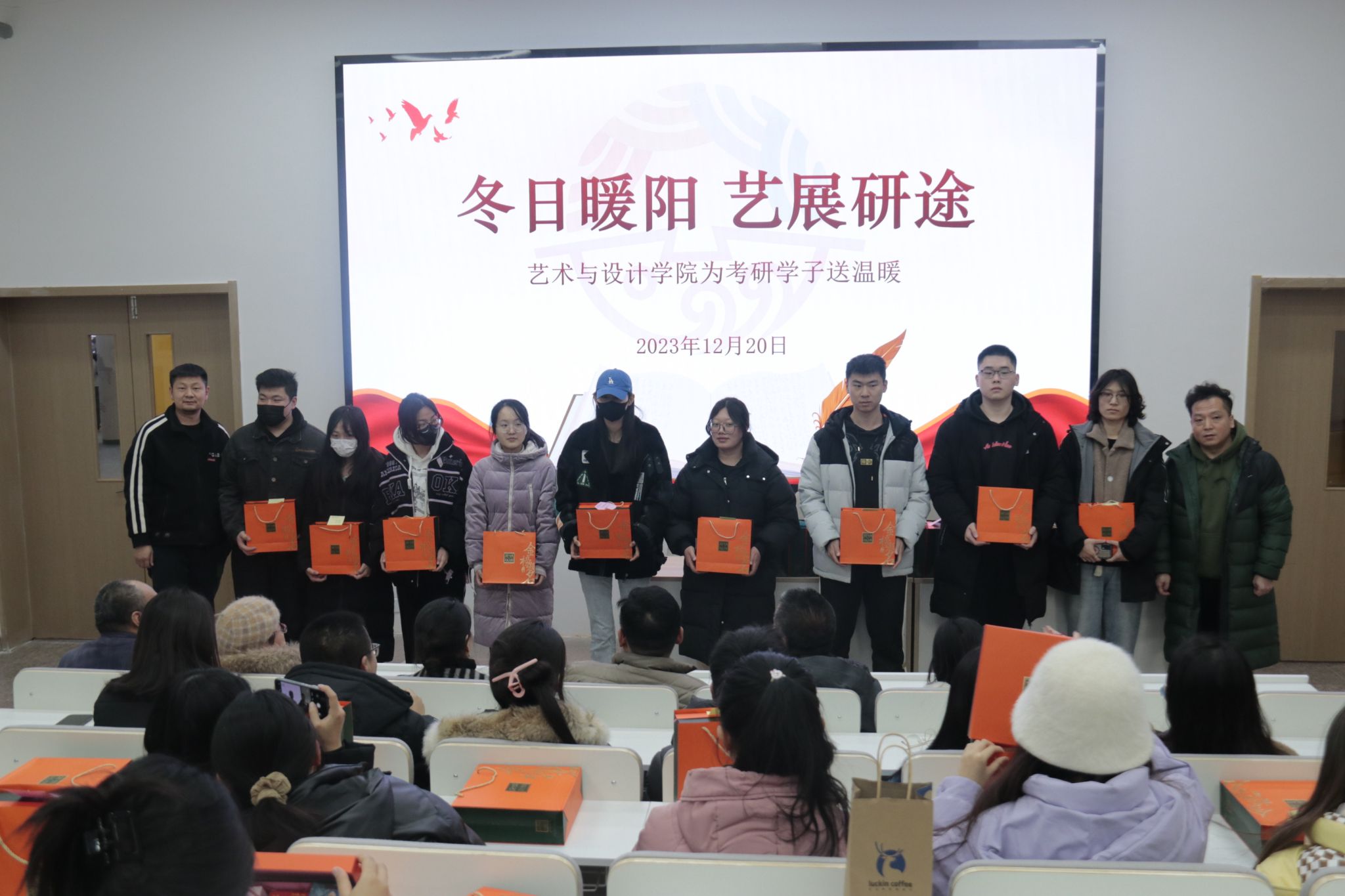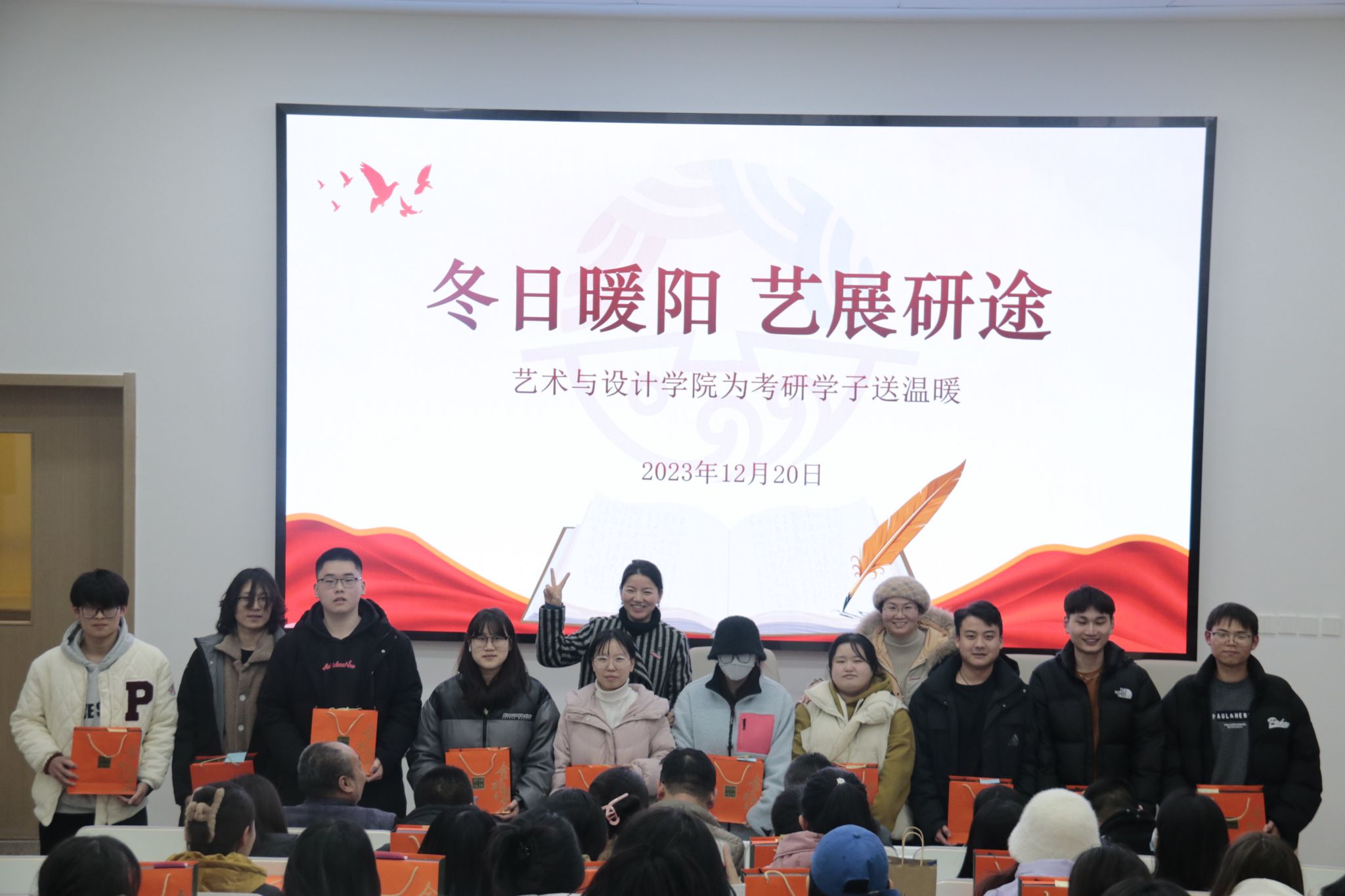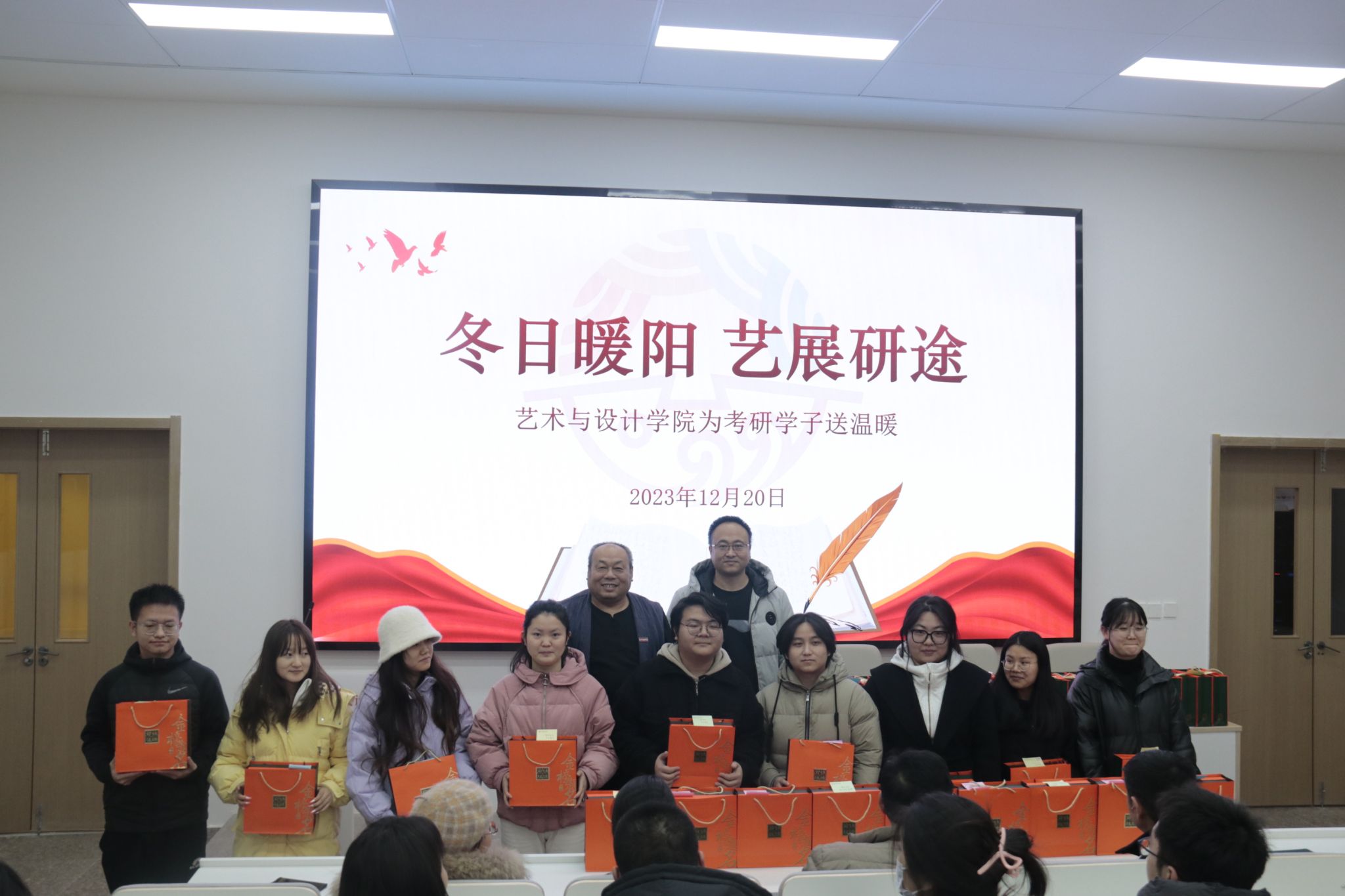 12月20日,在这个充满期待和奋斗的日子里,艺术与设计学院领导老师为考研学子组织了一场送温暖活动,为考研学子送上学院的祝福与关心。