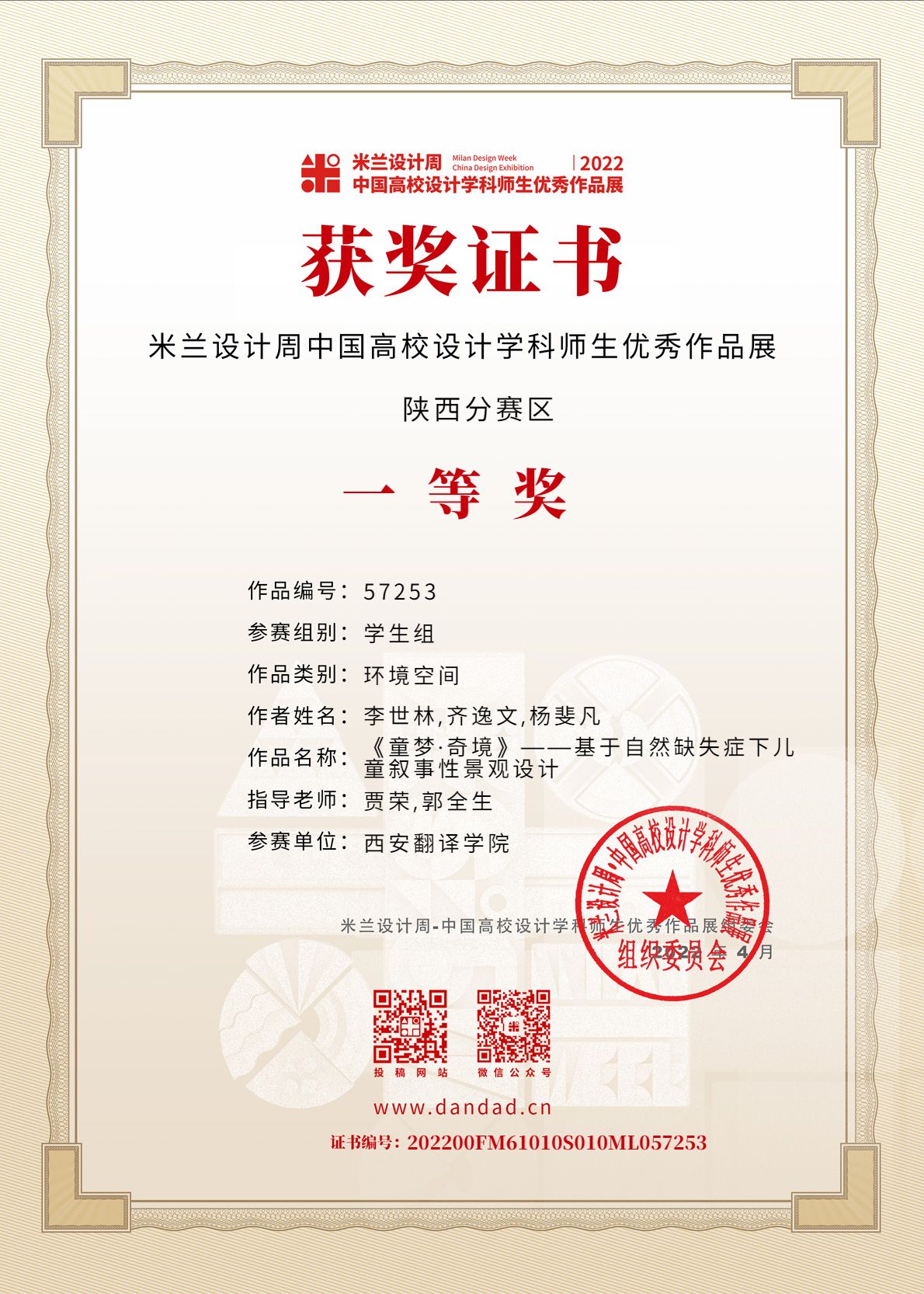 此次大赛通过省赛、国赛的比拼,最终我院李世林同学创作的作品《童梦•奇缘》基于自然缺失症下儿童叙事性景观设计,在贾荣老师指导下的作品荣获环境空间组省赛一等奖,国赛三等级。