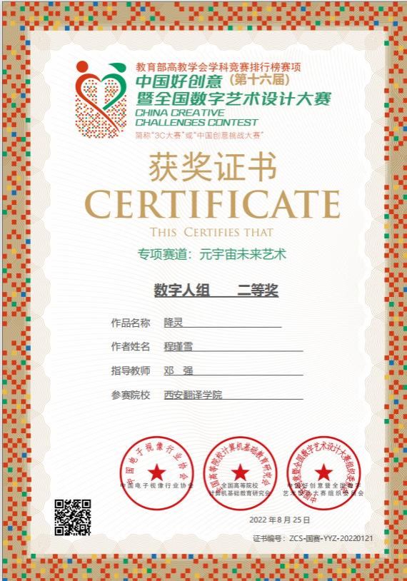 此次大赛通过校赛、省赛、国赛的比拼,最终我院魏靖童同学创作的作品“梦幻甘孜”—系列招贴设计,在江珊老师指导下的作品荣获视觉传达组国赛一等奖。程瑾雪老师创作的作品《降灵》荣获元宇宙数字人组二等奖。