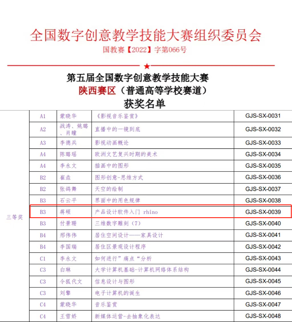 我校艺术与设计学院新媒体与产品系教师蒋硕在本次大赛中积极参与,作品《产品设计软件入门 rhino》荣获陕西赛区(普通高等学校赛道)三等奖。