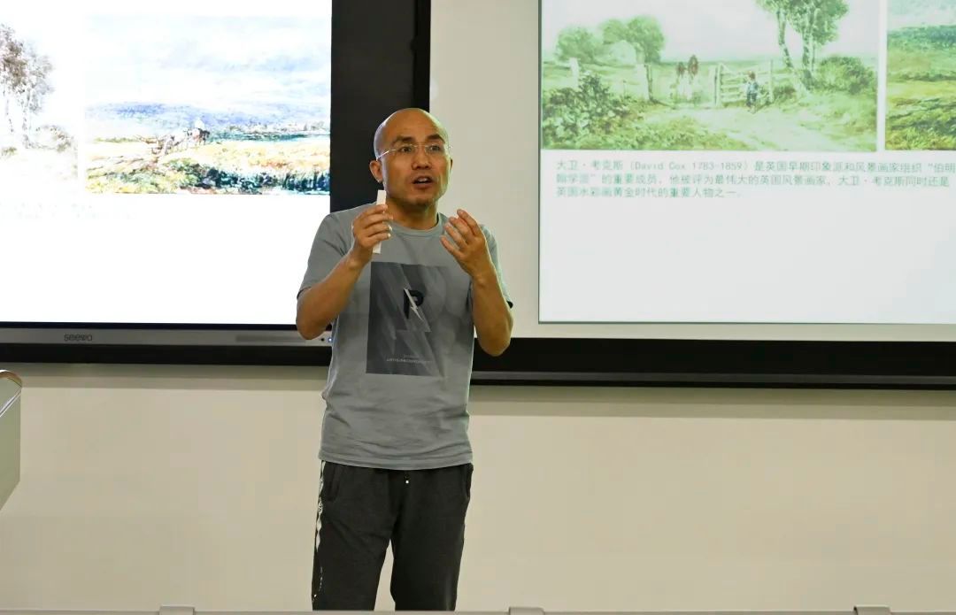 刘波老师以时间节点为主线,向同学们细致的讲述了古典时期绘画与空间的关系,包括空间特征、绘画的作用和特点。随后,他带领同学解读了英国水彩画,让同学们获得更深理解。在讲座最后,刘波老师还带大家一起欣赏了他的作品,带同学们在绘画作品中感受艺术魅力。