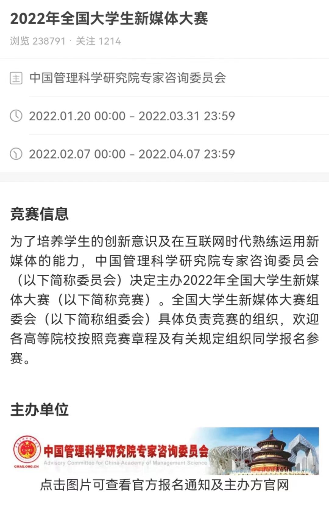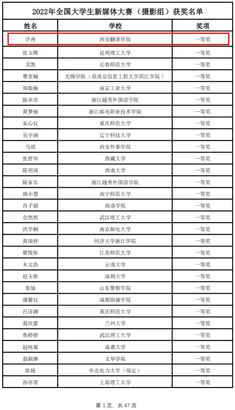 近日,2022年全国大学生新媒体大赛获奖名单公布,为了培养学生的创新意识及在互联网时代熟练运用新媒体的能力,中国管理科学研究院专家咨询委员会决定主办2022年全国大学生新媒体大赛,我院学子许冉荣获该大赛摄影组全国一等奖并位居榜首。