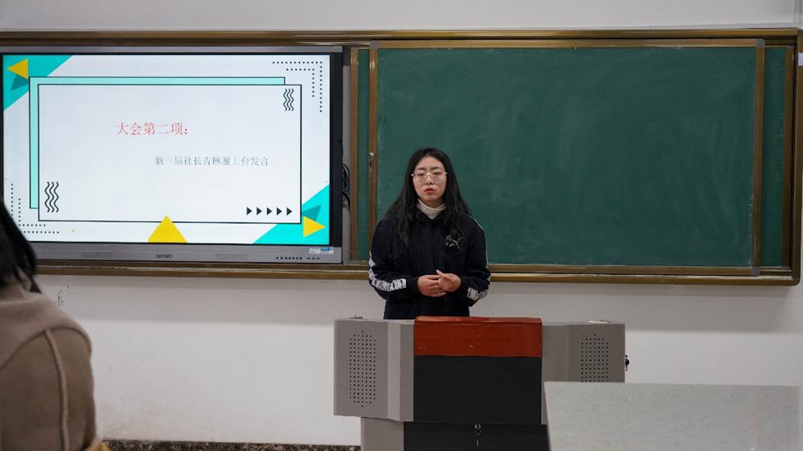 新社长在大会上表示会带领部员们扎实工作,有所作为,带领着新一届的工作室成员走向辉煌,最后由衷感谢老师和同学们对她的信任。