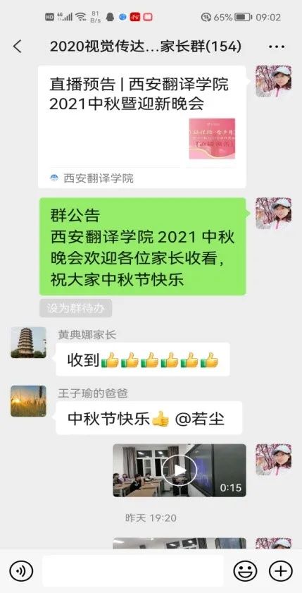 月到中秋分外圆,家到中秋格外亲。东流逝水,叶落纷纷,又是一年中秋至。为迎接中秋佳节,使在外求学的学生们感受到来自学校及老师的温暖和关心,增进师生之间的感情,9月17日晚上,艺术学院大一大二各班组织学生在教室收看“百年征程路 今夕月满圆”西安翻译学院2021中秋暨迎新晚会,共同欢度中秋佳节。同时,通过手机视频,学生们为家长也送上了中秋祝福。