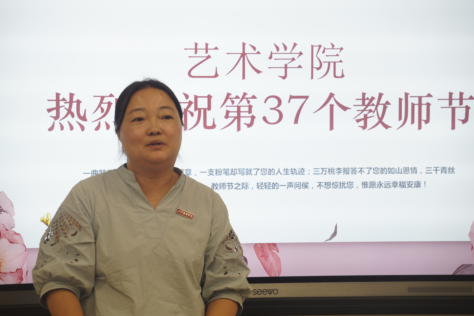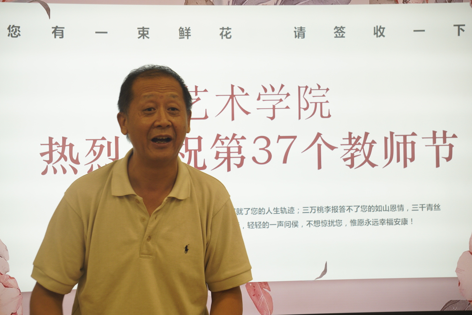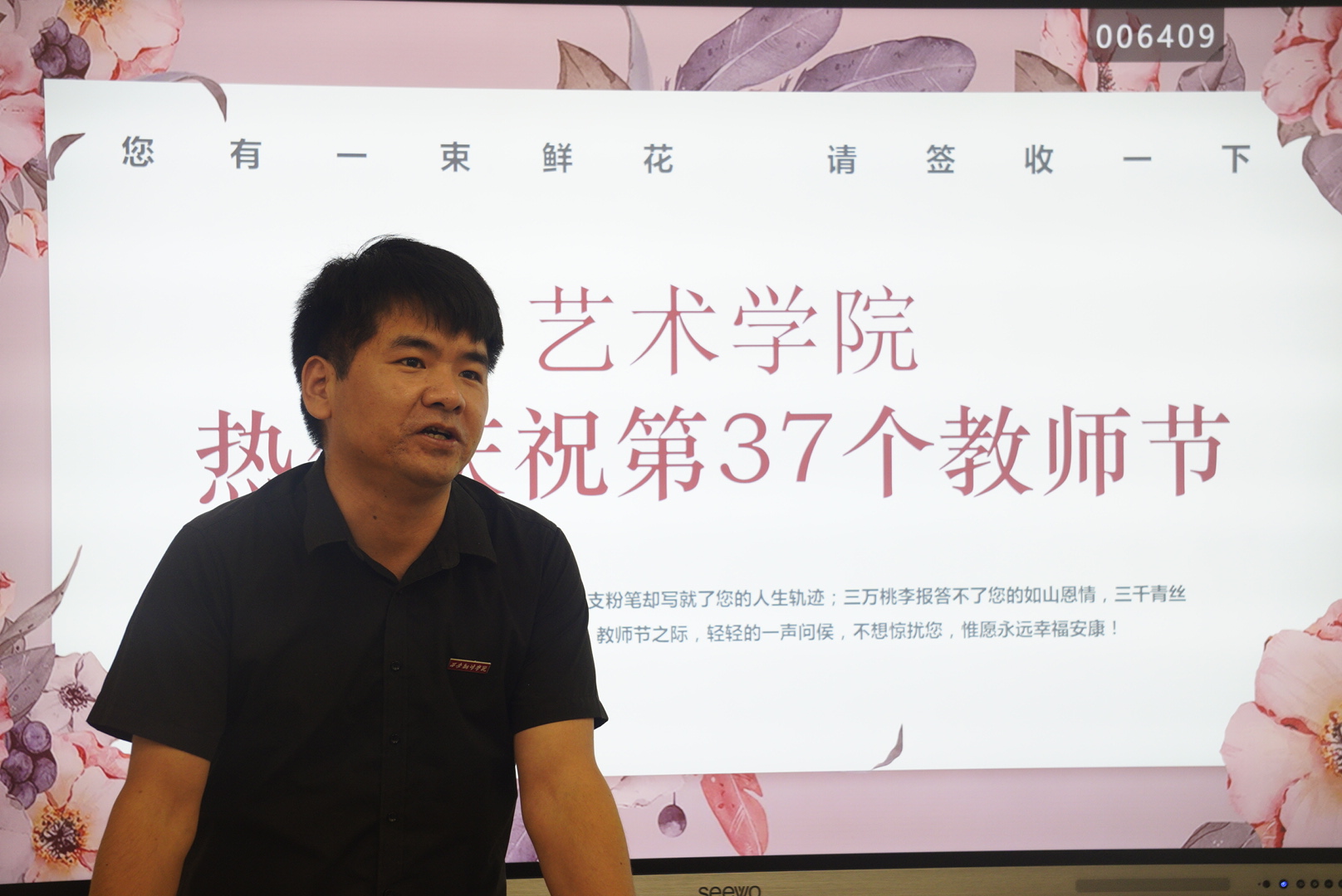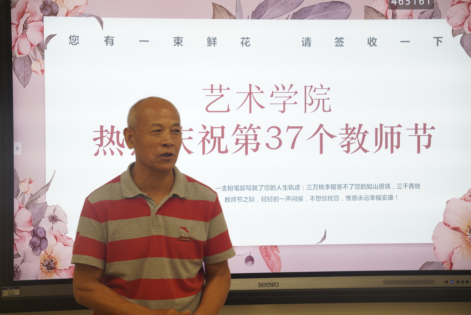粉笔一支恩情长,清风两袖园丁忙,讲台三尺勤耕耘,育才四方满天涯。为庆祝即将到来的第37个教师节,艺术学院于2021年9月9日在10t12教室举行了教师节庆祝活动,本次活动由左明刚副院长主持。参加活动的人员有各位领导、专业教师以及各位辅导员。