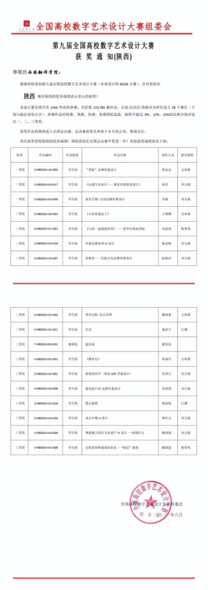 日前,第九届全国高校数字艺术设计大赛(未来设计师NCDA大赛)省赛评审结果揭晓,西安翻译学院艺术学院在院领导支持与指导下,各系教师积极准备、策划、规范管理、持续发力,17件学生作品在此次比赛中获得一等奖3项、二等奖7项和三等奖10项!
