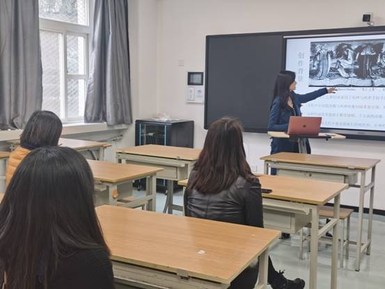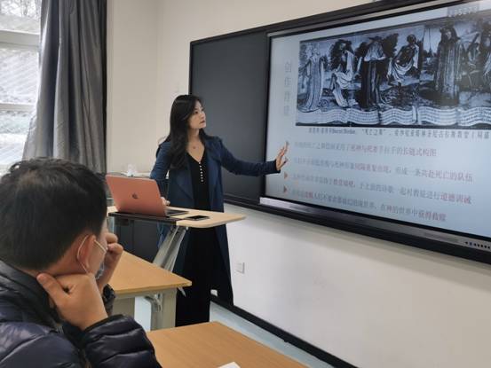 观摩课中陈老师讲到:中世纪时期欧洲大陆在经历黑死病侵袭时,人们是以什么样的状态和心态去面对死亡与疾病。那么这个时期的艺术在表达什么?用什么样的形式来表达?最终起到了什么样的作用?陈秋妤老师带着这三个问题给大家讲述了一段特别的“死亡艺术”课程。
