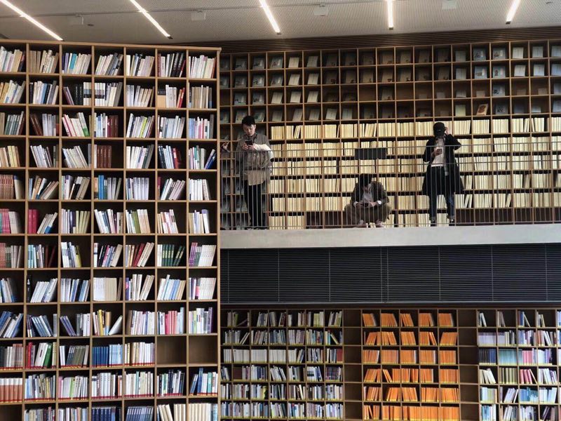 晓书馆其内部分上下两层,10多个原木色书架高耸入屋顶,有种书山书海的即视感。落地窗外有一方浅水,花开花落,再配上馆内提供的桌椅、沙发、落地榻榻米靠垫,恍惚间真的有种回到大学校园的感觉。