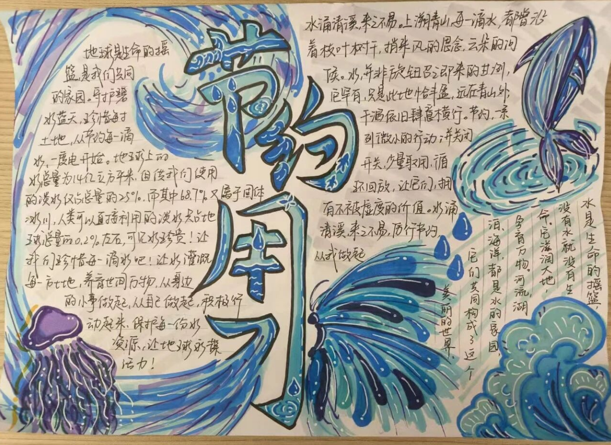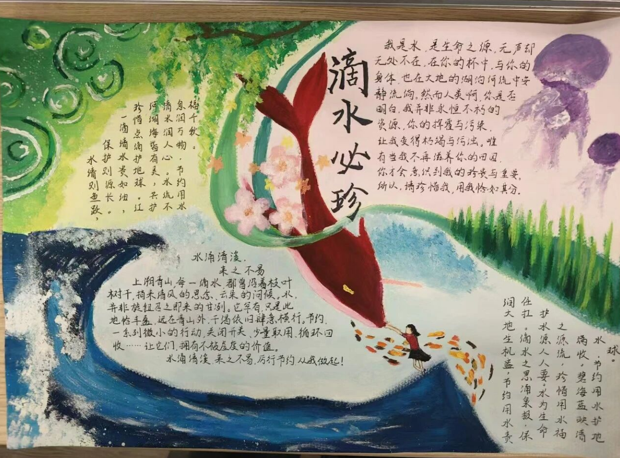 活动中,同学们用彩笔勾勒江河湖海的灵动,以色彩渲染节水护水的愿景:有的以细腻笔触描绘“滴水成河”,用深浅不一的蓝色呈现水资源的珍贵;有的用漫画形式生动展示“关紧水龙头”“一水多用”等节水小技巧,画面鲜活又易懂;还有的写下朗朗上口的节水标语,用简洁有力的文字传递“惜水每一滴”的心声。