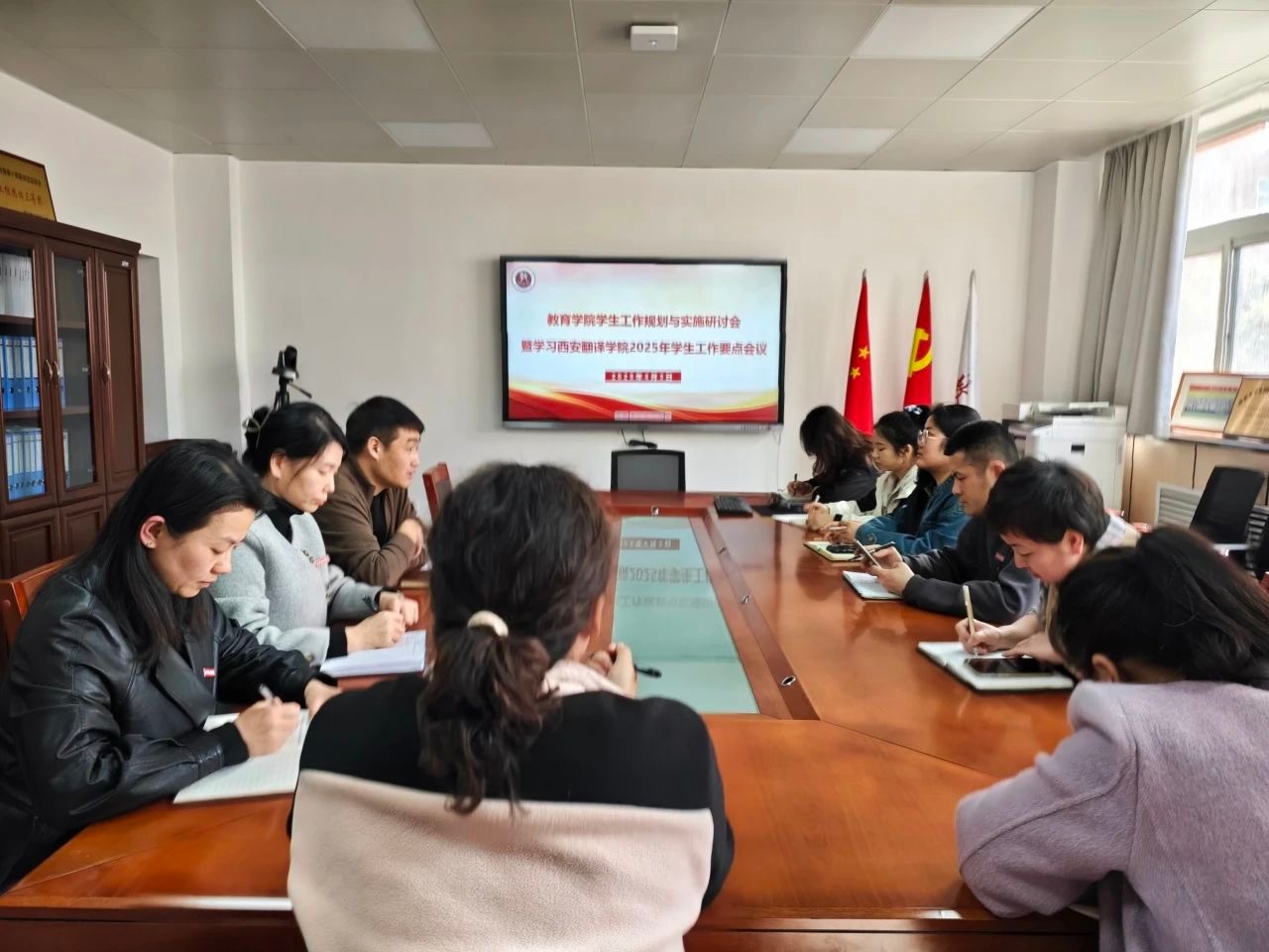 会议还深入学习了西安翻译学院2025年学生工作要点。潘亮亮结合教育学院实际情况,对要点进行了详细解读和部署。他要求全体辅导员要紧密围绕学校中心工作,将立德树人融入学生思想道德教育、文化知识教育和社会实践教育各个环节。