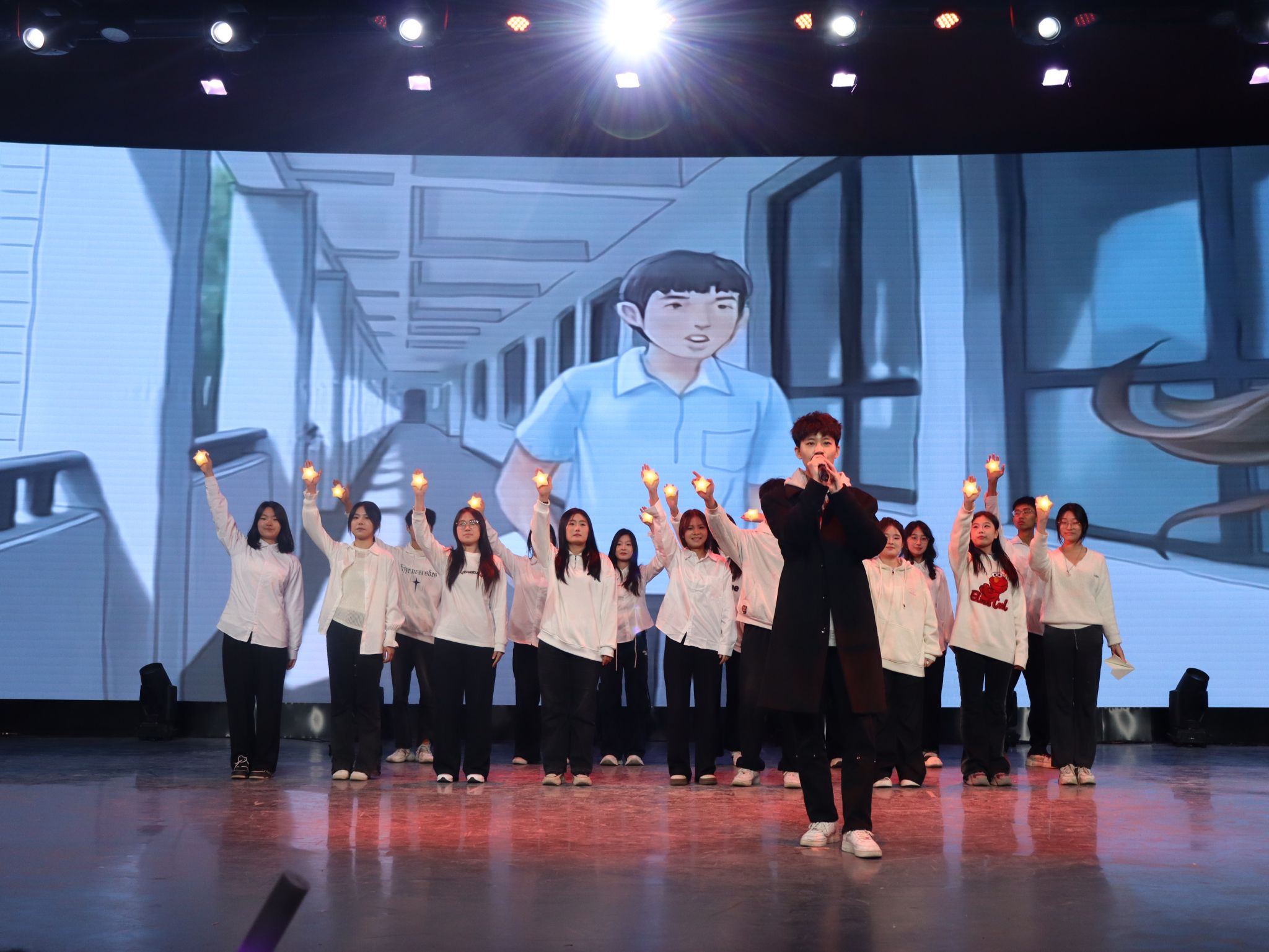 晚会即将结束之际,董千上台致辞,他表示艺术嘉年华活动不仅是对新生热烈欢迎的盛会,更是承载着大四学子珍贵记忆的重要时刻。对新同学而言,这是一场标志着人生新篇章绚烂开启的庆典,是梦想扬帆起航的庄严仪式。对于即将步入社会的大四同学而言,这则是对过去岁月美好瞬间的凝练,是对青春记忆的深情缅怀。自艺术与设计学院成立以来,艺术嘉年华见证了无数艺术灵感的闪耀,记录了众多学子的成长与蜕变。它犹如一部鲜活的艺术编年史,在校园中留下了深刻的烙印,架起了连接各届学子心灵的桥梁与纽带。最后,董千向全体同学表达了衷心的祝愿:期望新同学们能够在此嘉年华中汲取能量,勇敢追求梦想,持续前进。祝愿大四的同学们携带着这份珍贵的回忆,踏上更为广阔的人生舞台,继续在艺术的道路上绽放独特光彩。