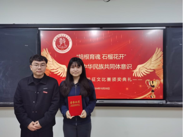 颁奖仪式于2024年10月30日在教育学院顺利举行,颁奖老师闫玉虎、张美娜、侯莹为获奖者颁发了荣誉证书,那一刻,喜悦与荣耀交织,激励着每一位获奖者继续前行。她们以精彩纷呈的作品,为大赛增添了无限光彩。获奖者们纷纷表示将以此次比赛为契机,继续深入学习党的民族政策,积极传播民族团结的正能量,为构筑中华民族共有的精神家园贡献自己的力量。