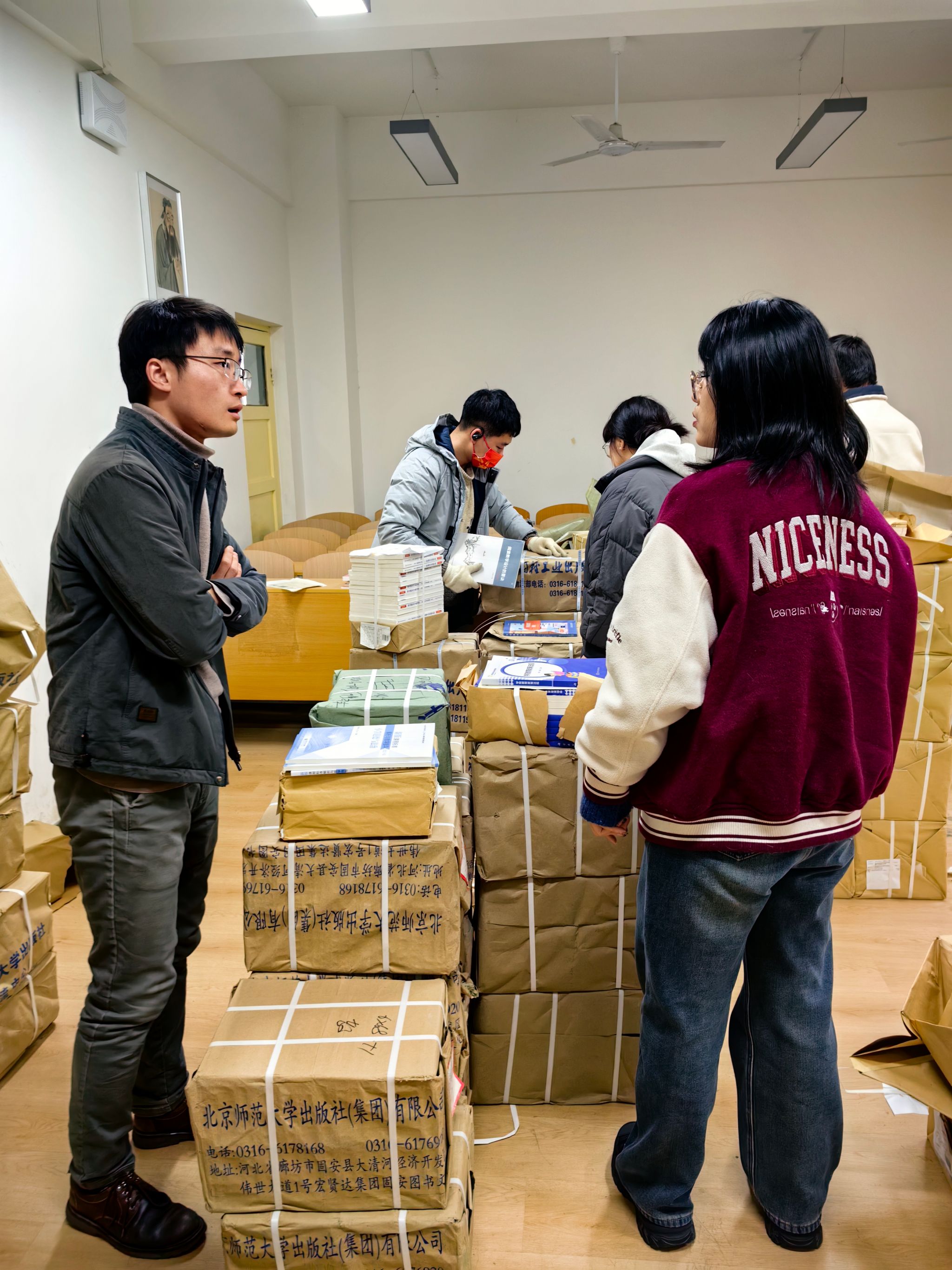 3月2日,辅导员领取新学期教材,打扫教学楼卫生,配齐所需工具,使各教室桌椅摆放整齐、卫生干净整洁,为学生上课前做好了充分的准备工作。