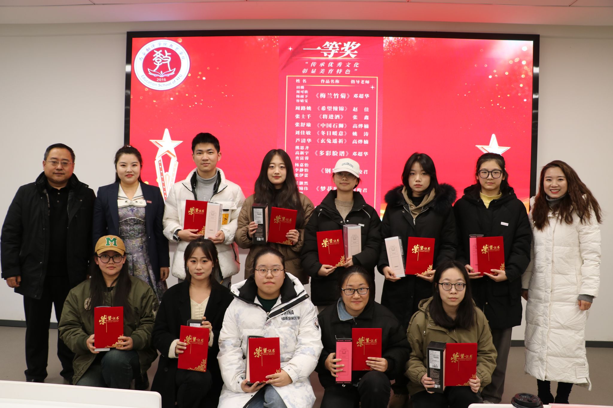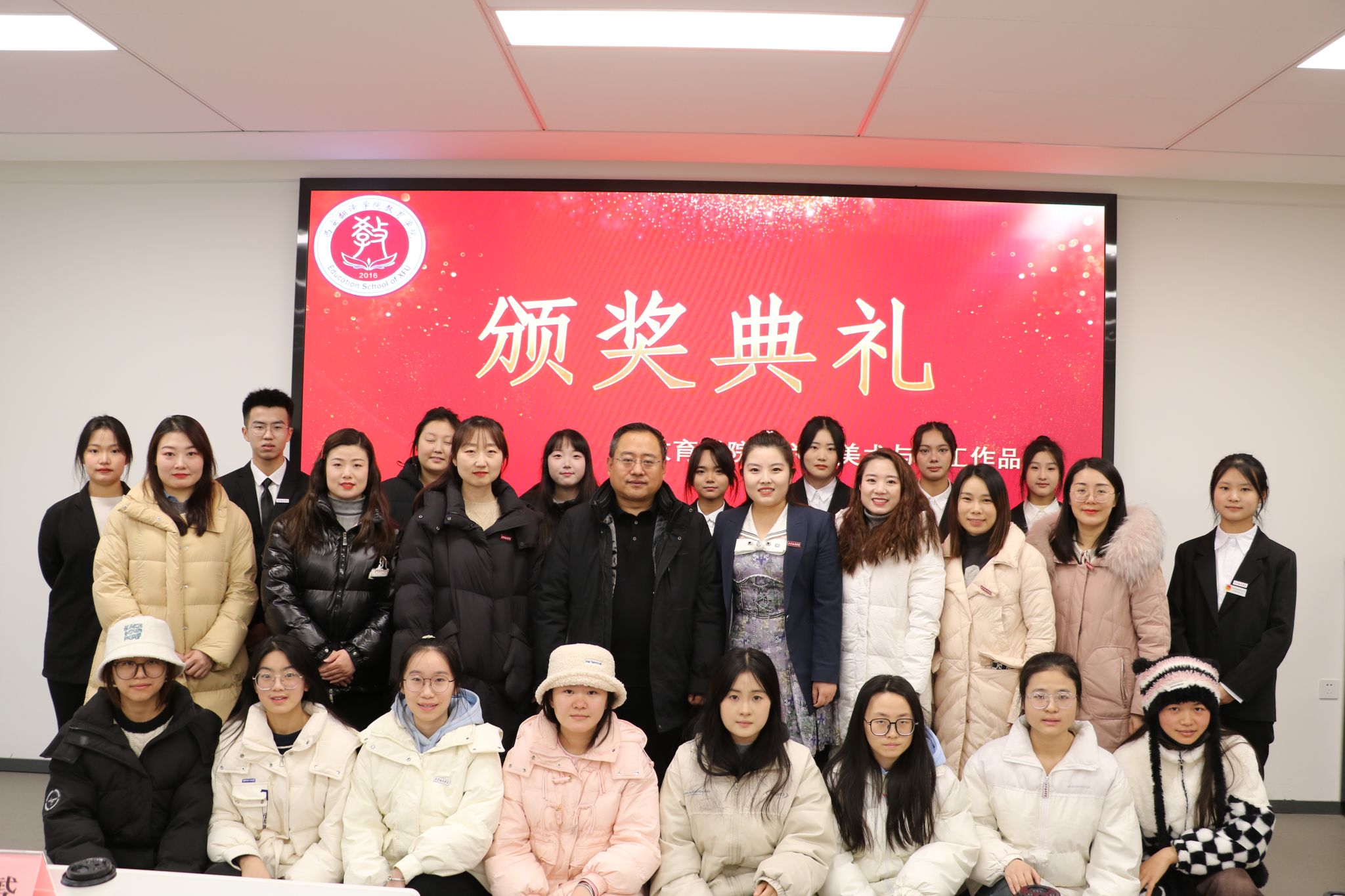 2023年12月22日教育学院在八号楼二楼学术报告厅举行“传承优秀文化,彰显美育特色”——教育学院第六届美术与手工作品展颁奖典礼。莅临颁奖仪式的领导老师有:教育学院党委书记、副院长王小龙,教育学院副院长庞小佳,西安翻译学院美育教学中心主任、教育学院副院长辛维英,教育学院综合办副主任张改宁,教育学院学前教育系主任黄玉芳,教育学院技能教学中心主任张鹤,学前教育系副主任杜赟以及教育学院技能教学中心的美术老师们。
