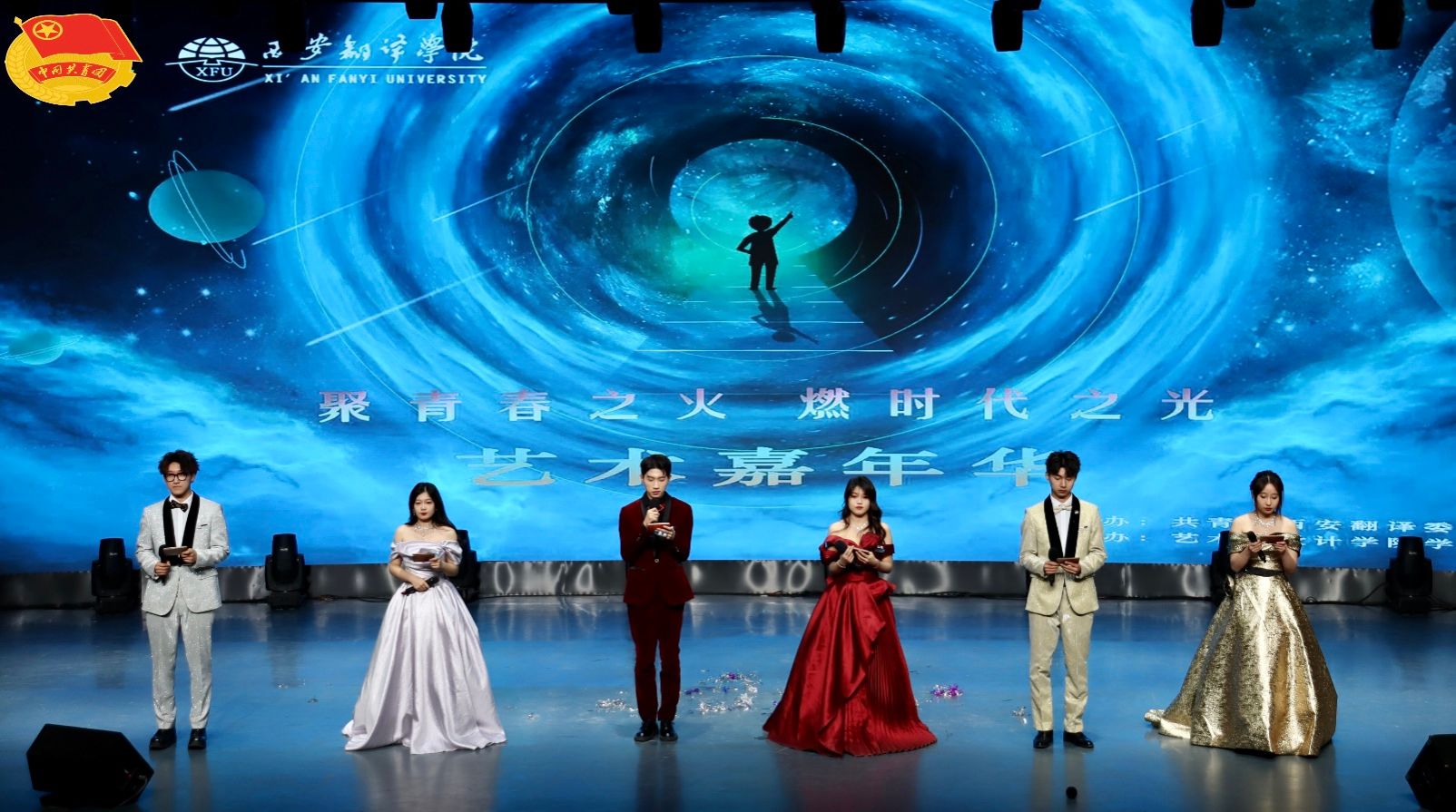 12月18日晚,由共青团西安翻译学院委员会主办,艺术与设计学院学生会承办的“聚青春之火,燃时代之光”第七届艺术嘉年华文艺晚会在科技楼演播大厅隆重举行。莅临本场晚会的领导及嘉宾有西安翻译学院校团委副书记岳蓓,英文学院团总支书记闫丽洁、团总支副书记任珂、国际商学院团总支书记苏云鹤、团总支副书记闫斌、文学与传媒学院团总支副书记苏津津、护理与康复学院团总支书记赵晓晓、体育学院团总支书记陈楠、艺术与设计学院综合办副主任王瑛及艺术与设计学院部分老师和辅导员代表。