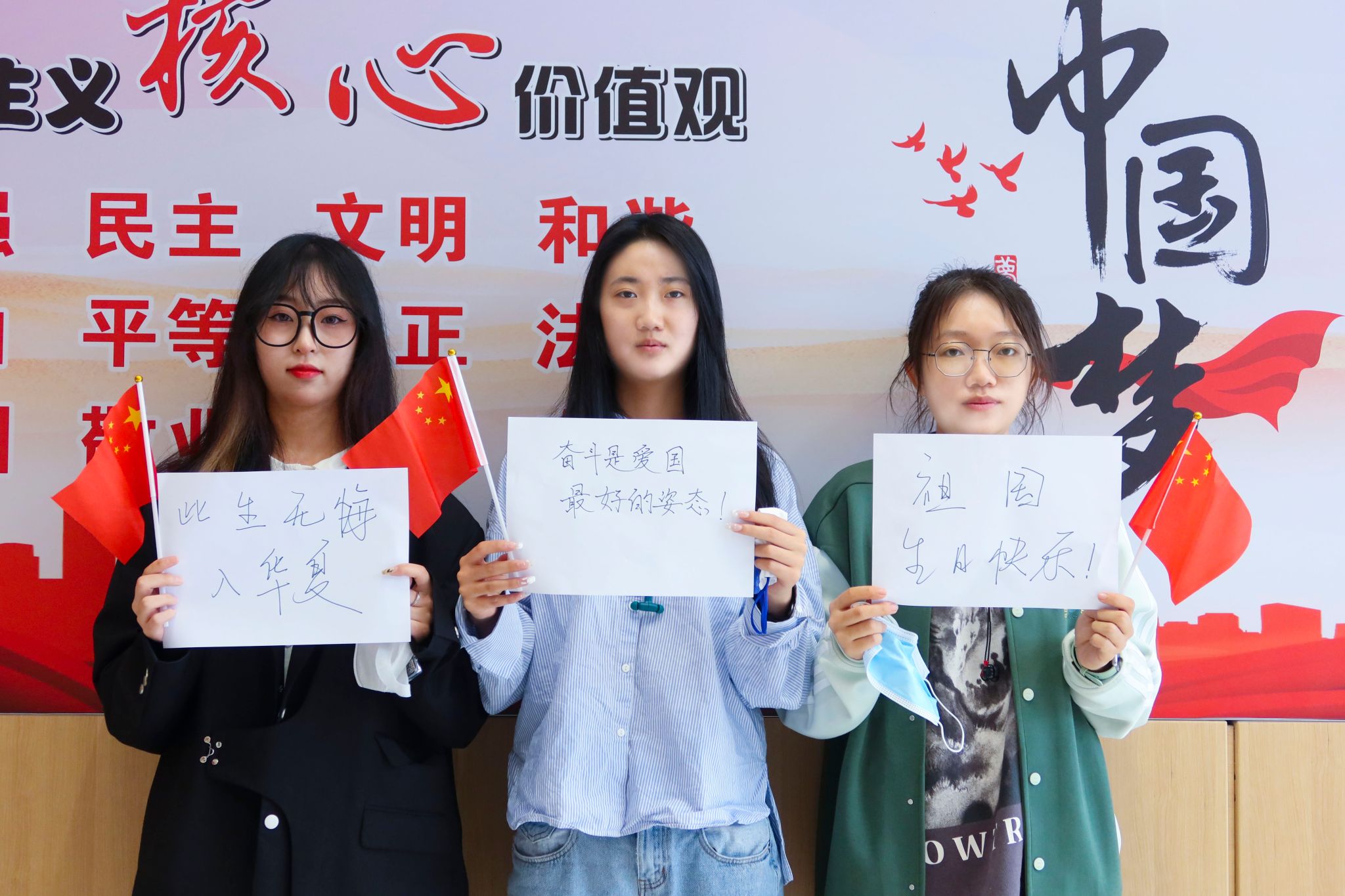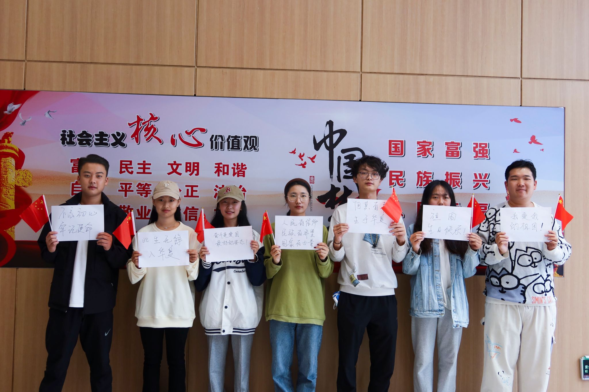 期间,团学青代表和同学们在纸上写下自己对祖国的美好祝福,并且对其进行拍照留念。